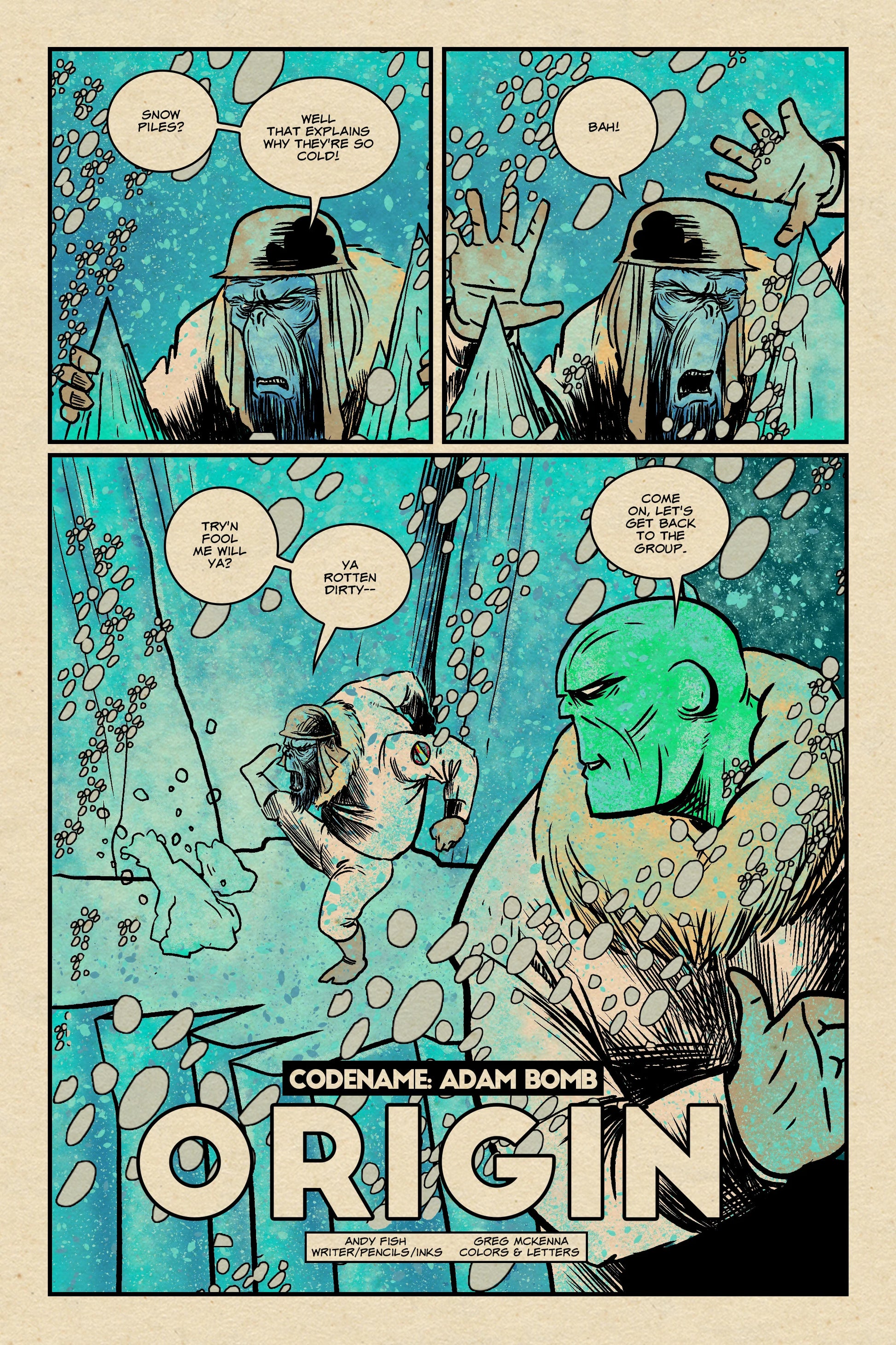 ADAM BOMB'S origin is uncovered by an investigative reporter while on a secret mission to the Icy Plains of Greenland!