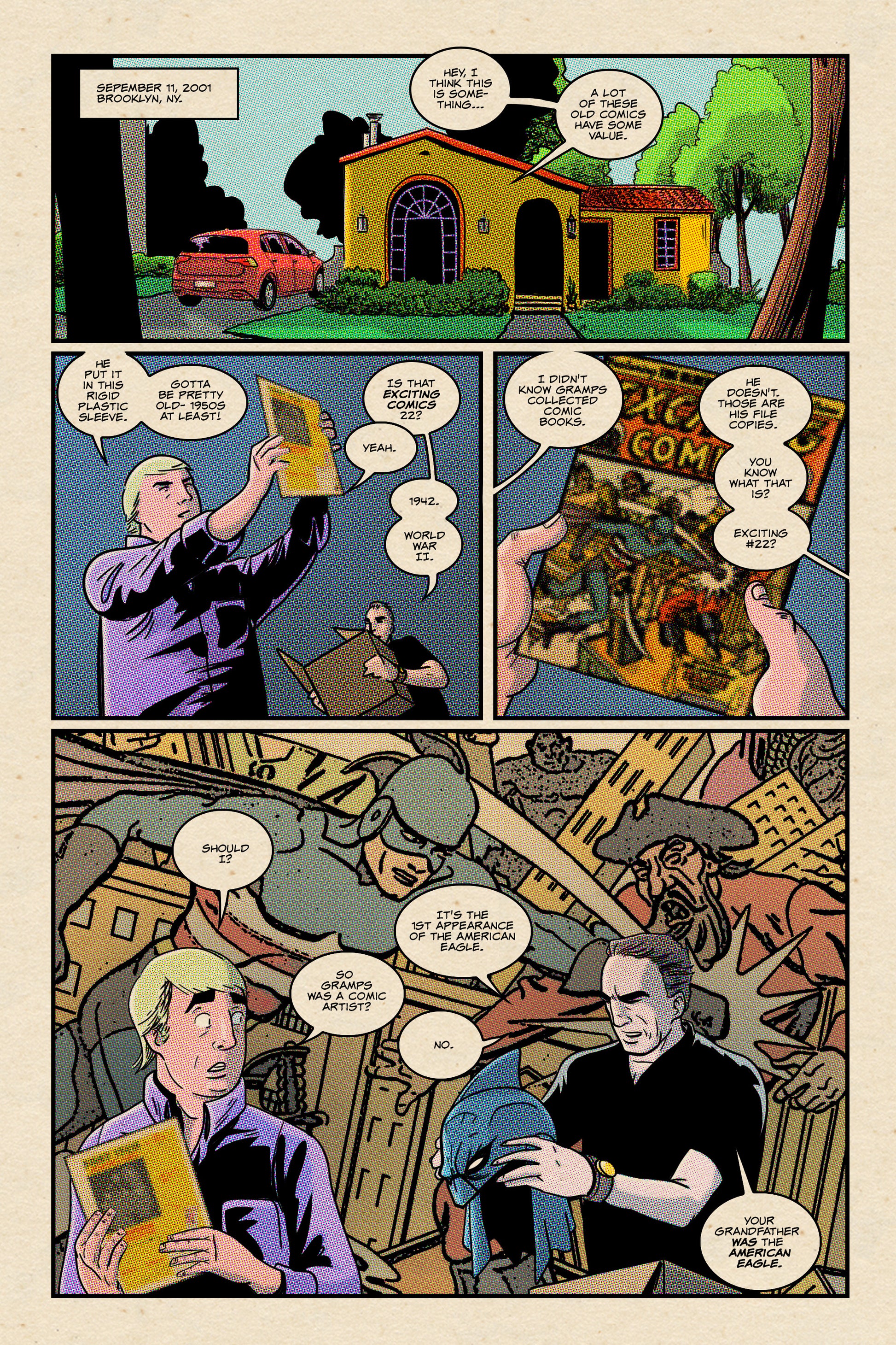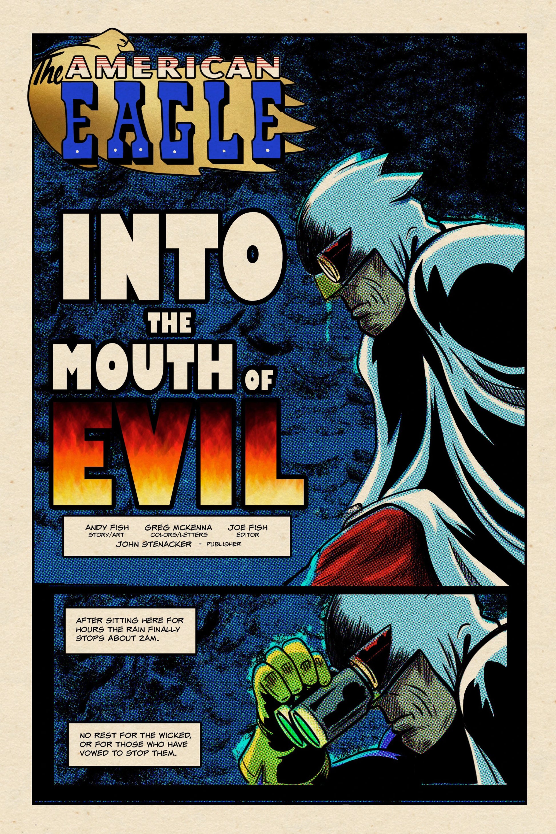 AMERICAN EAGLE - The WWII hero is back in the form of the grandson of the original! When terrorists attack the World Trade Center on Sept 11th it becomes personal for Mike Standish and he vows to take up his grandfathers crusade-- ripped from Today's headlines mixed in with the craziness of the world around us the American Eagle is a hero you've never seen before! By Andy Fish with Adam and Joe Fish and Greg McKenna! Includes a reprinting of the original AMERICAN EAGLE from 1942